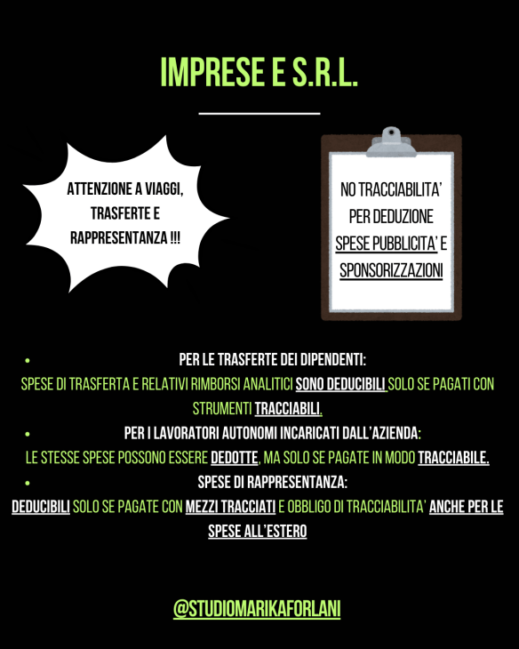 Dal 2025 sarà obbligatorio sostenere in modo tracciabile le spese di trasferta e di rappresentanza, al fine di ottenere la deduzione fiscale. Con “tracciabile” si intende, ad esempio, metodi di pagamento come bonifici, carte di credito etc..